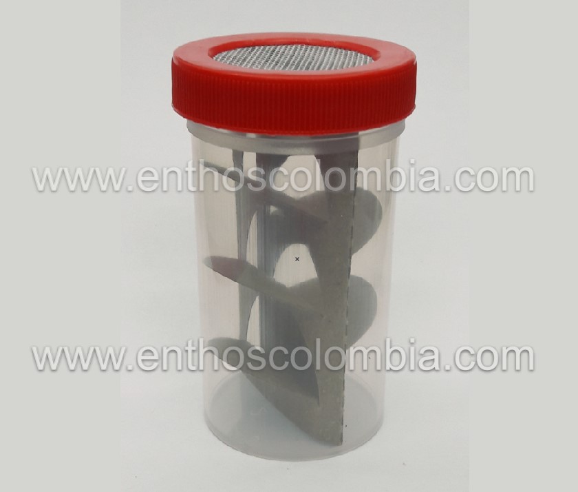 Frasco plástico transparente , tapa con malla metálica para ventilación y soporte interno que reduce el estrés del insecto durante el transporte